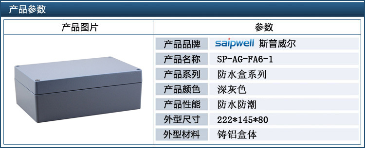 | 防水等级 | IP66 | 外形材质 | 铸铝 | 外形尺寸 | 222×145×80 |