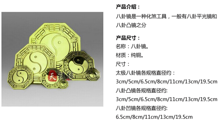 八卦镜是一种化煞工具,一般有八卦平光镜和八卦凸镜之分。 它的性质为遮挡户外不良建筑形状,比如墙角或者尖形的大厦等,用法就是放在屋外,如悬挂在屋檐、墙壁上,忌放在室内照人!因此此物只能对外,不论任何形煞皆可化解。但不宜挂的太多,一个方位只能挂一个,全屋别超过三个,否则必会自伤,不吉反凶。 八卦镜
