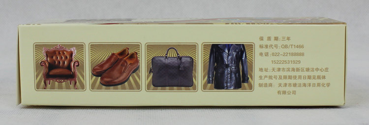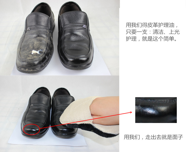 不用刷子、不用水洗、不用去污、直接用毛巾擦,上色、上光、滋润、保养、去污一次完成!可以保养擦皮鞋、皮衣、皮沙发、运动鞋、旅游鞋,男士公文包,女士皮包等所有皮革产品!一支可以保养200双左右的皮鞋,10-15件皮衣,6-8套皮沙发!一个家庭擦鞋可以使用一年,擦一次鞋只需要几分钱,上一次油光亮度保持3-7天。具有不褪色,不掉色,不染色,不脏手,不脏裤脚,不脏袜子的特点!是目前为止最好的皮革保养产品。擦了沙发马上可以坐,擦了皮衣马上可以穿......(操作方法细节请来电索取)