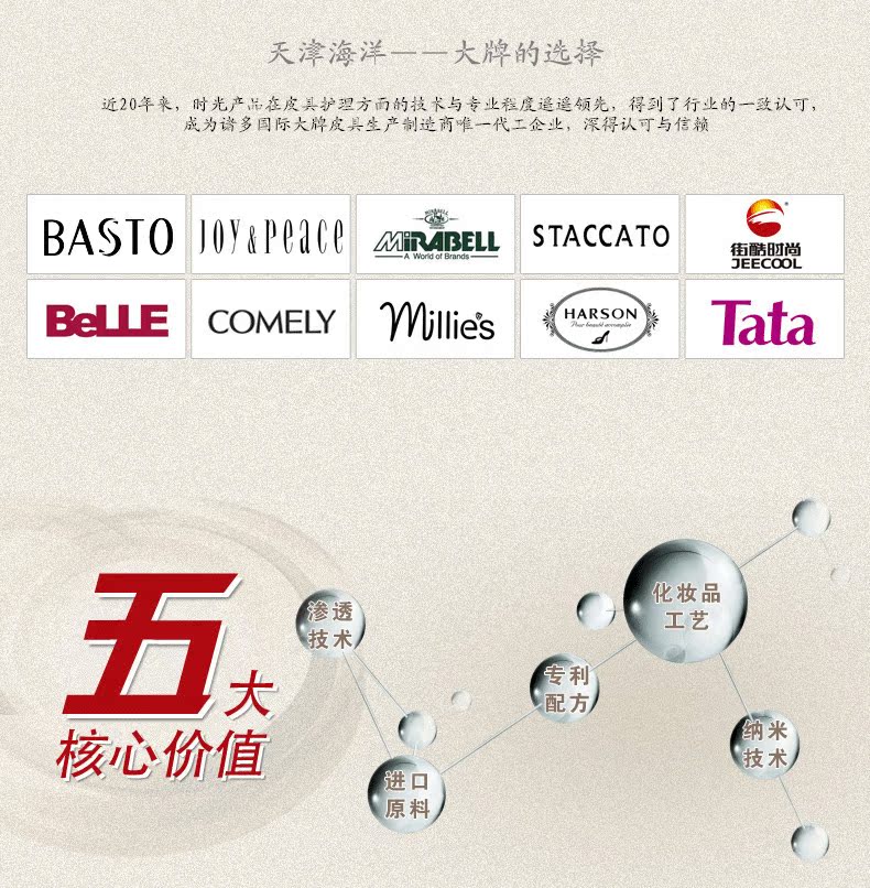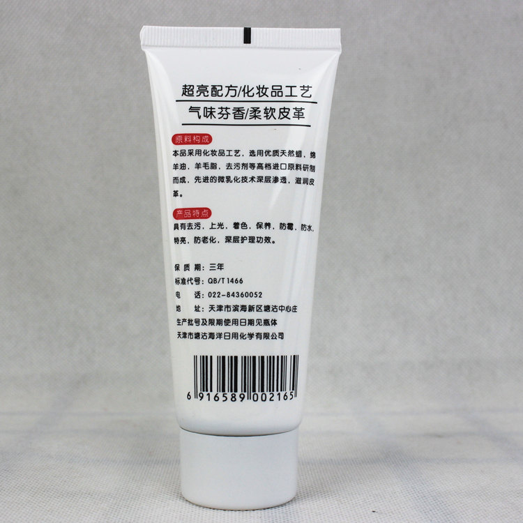 本产品采用优质卡那巴蜡、护革蛋白、绵羊油、柔软剂、防腐剂等化妆品级原料,应用超微乳化技术精致而成。适用于所有光面皮革制品深层保养和护理,具有滋润、柔软、防霉、防水、去污、补色、上光、延长皮革制品使用寿命之功效,并且对变硬的皮革有挽救功能!