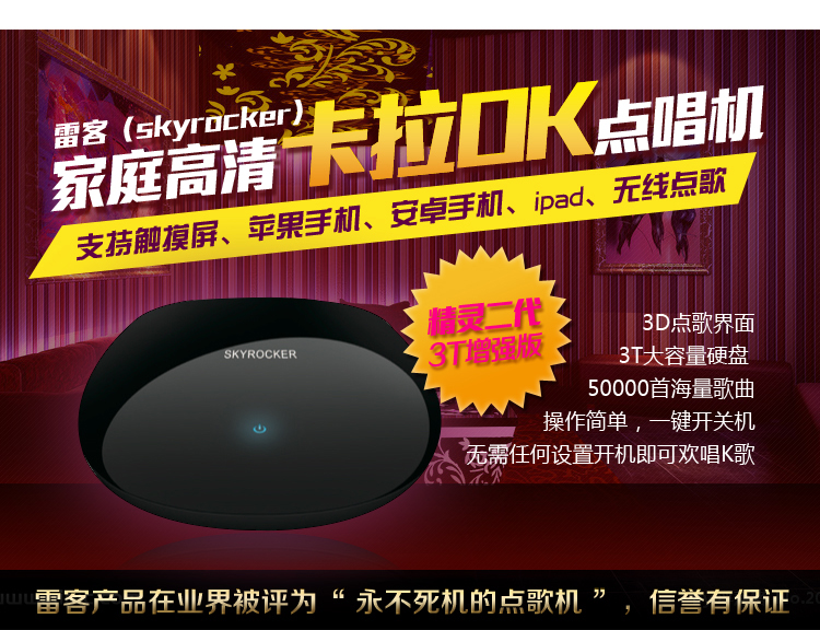 雷客家用点歌系统2013年隆重推出“云十二”系列点歌机,3T/4T大容量硬盘,5000/70000余首原人原唱歌曲,1000/3000首HD高清歌曲,支持智能手机、iPad等时尚点歌新方式,开启K歌发烧友们新一番旅程,让你的家庭卡拉OK生活更精彩!