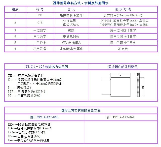 3、致冷器的热电偶对数及极限电压的识别方法,热电偶对数即指P、N结点的数量。例如:致冷器的型号为TEC1-12706,则127为致冷器的热电偶对数,06为允许电流值(单位:A),致冷器的极限电压≈热电偶对数×0.12,例如: TECI一12703的极限电压V=127×0.12=15.2(V)。
