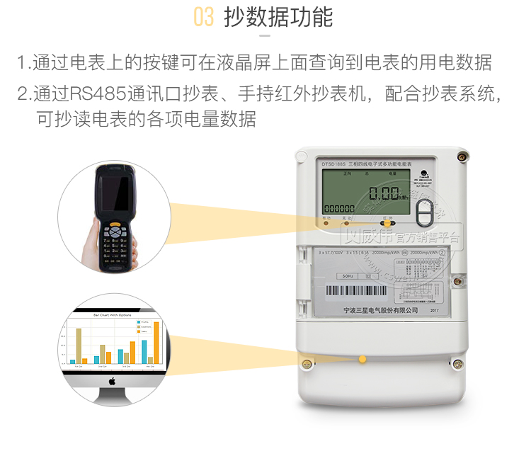 ② 通过手持红外抄表机,可读取电表的各项数据,包括每月、每小时、每分钟数据。