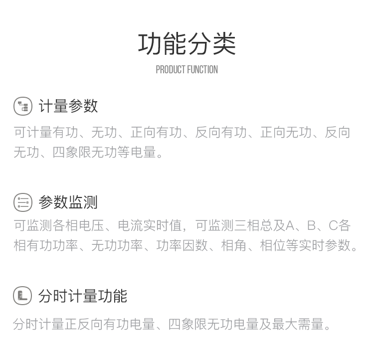 ① 计量参数:可计量有功、无功、正向有功、反向有功、正向无功、反向无功、四象限无功等电量。