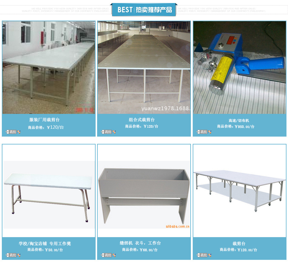 常熟市旺旺台板厂是裁剪台、检验台、工作台、长凳、方凳、缝纫机衣斗、等等产品专业生产加工的公司,公司总部设在江苏省常熟市海虞镇,旺旺台板厂拥有完整、科学的质量管理体系。常熟市旺旺台板厂的诚信、实力和产品质量获得业界的认可。欢迎各界朋友莅临常熟市旺旺台板厂参观、指导和业务洽谈。 |