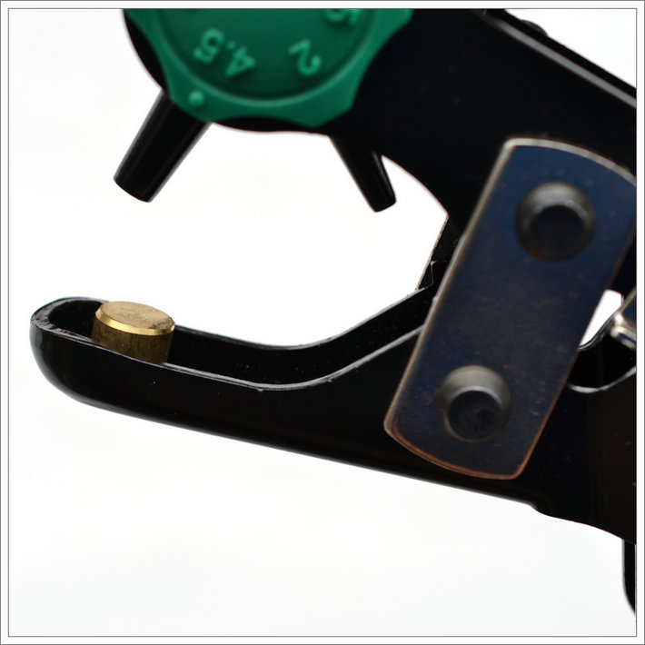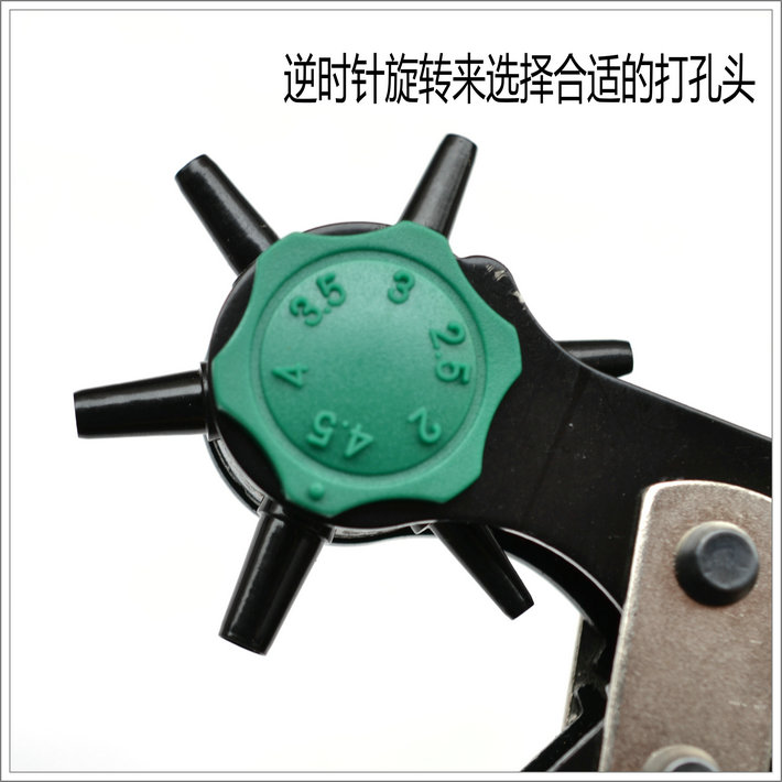 产品特点:★采用优质高碳钢精工锻造,钳口热处理★转动齿轮选择不同尺寸的冲口打孔,操作简单方便★冲口尺寸为:2mm,2.5mm,3mm,3.5mm,4mm,4.5mm★适用于皮具,皮带,腰带,硬纸卡,纸张,肩章,硬质pvc等多种材料的打孔使用