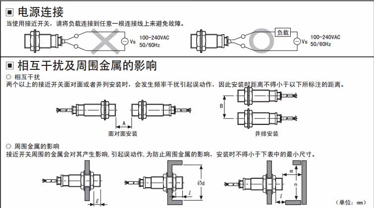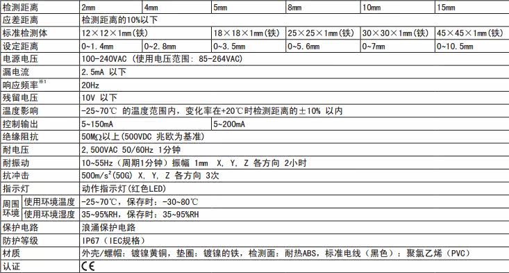 主要特性* 采用自主研发的专用IC提高产品抗干扰性能* 内置电源反接保护电路(DC3线型)* 内置浪涌保护电路* 内置过流保护电路(DC型)* 寿命长,可靠性高,经济且操作简单* 通过红色LED灯可确认接近开关工作状态* IP67防护等级(IEC规格)* 应用广泛,可替代微动开关及限位开关