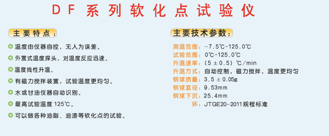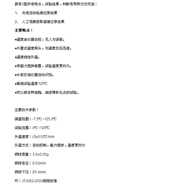 温度由仪器自控,无人为误差。 外置式温度探头。对温度反应迅速。温度线性升温。有磁力搅拌装置,试验温度更均匀。水或甘油仪器自动辨别。可以做各种油脂和油漆等软化点的试验。