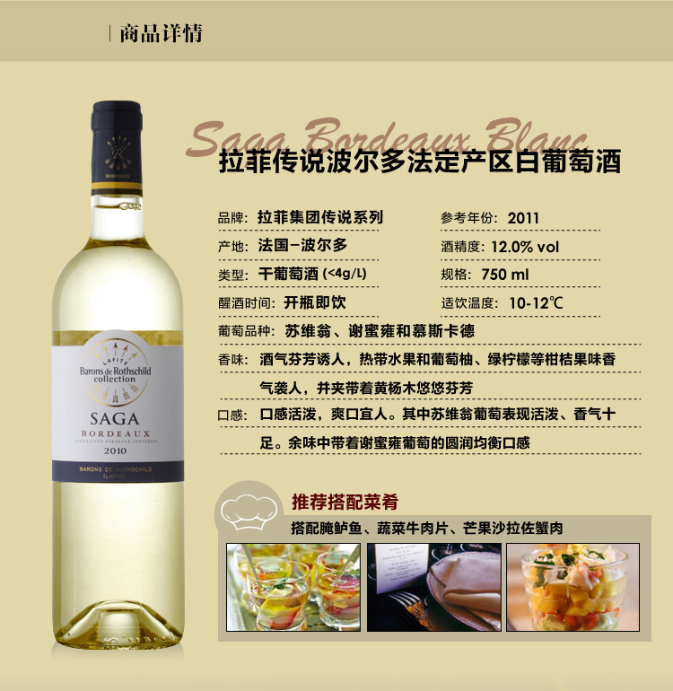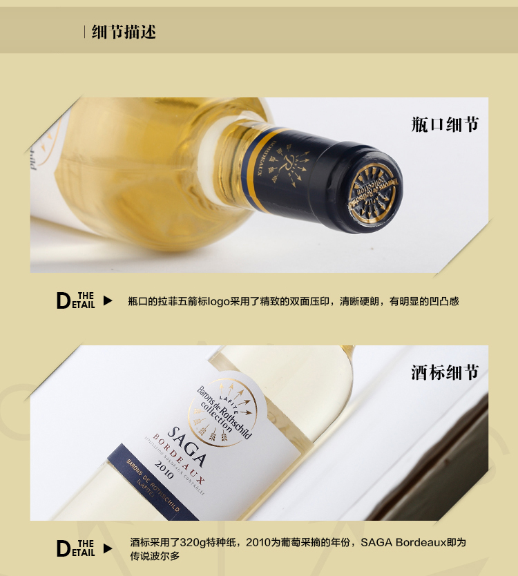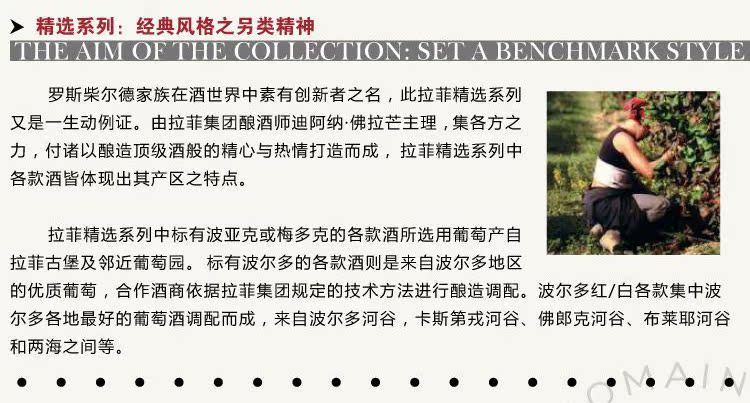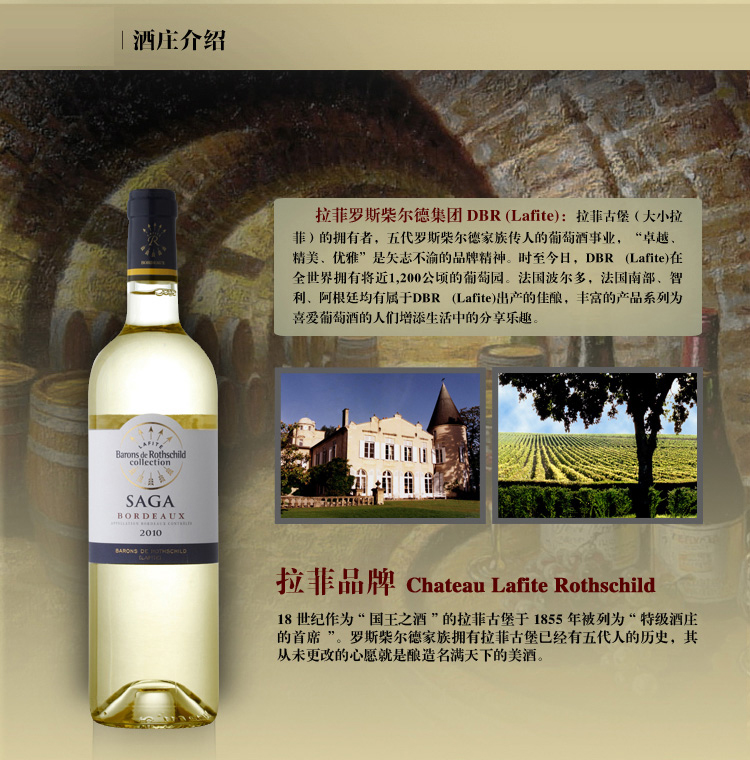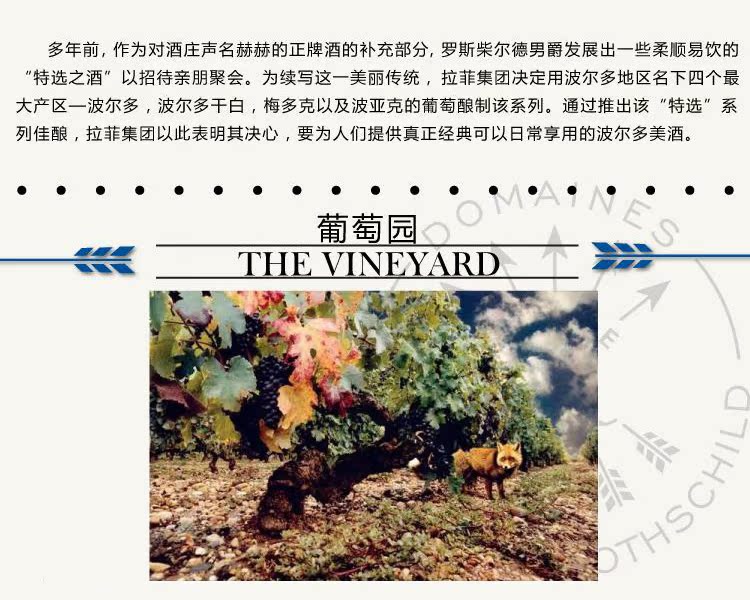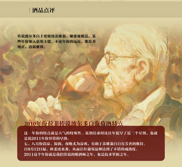 举世皆知,法国波尔多不仅仅是顶级名酒的代名词。拉菲酒庄在这片被神亲吻过的土壤涵盖了多样的精品佳酿,优越的风土条件以酿制多种类型葡萄酒。 波尔多白使用苏维翁和谢蜜雍两类品种酿造。不论年份的远近,都果香纯正,清新雅致。