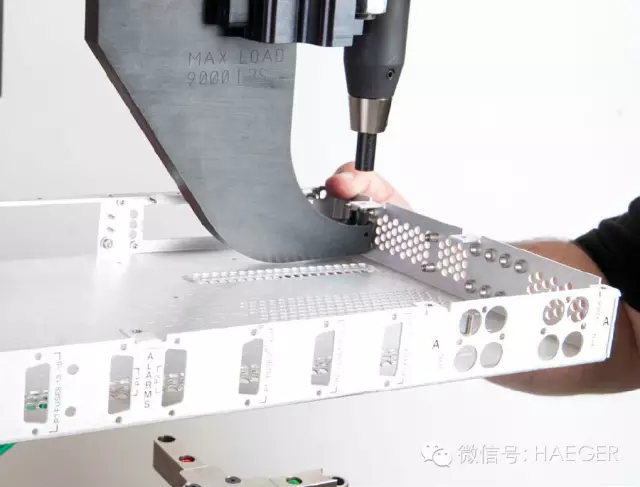 Haeger专利的安全系统使操作工位于设备导电非导电工作模式下的全方位保护,极大地提升了操作人员的信心和插件效率。这是一个在行程内适应任何长度刀具的专利系统,可在任何行程点施加工作压力。该系统无需操作者进行任何调整,故不会增加设备初始化设置时间和刀具更换时间。因基材的不同可设置不同的驻留载荷时间,它可完美地压接紧固件到不锈钢板材当中去。