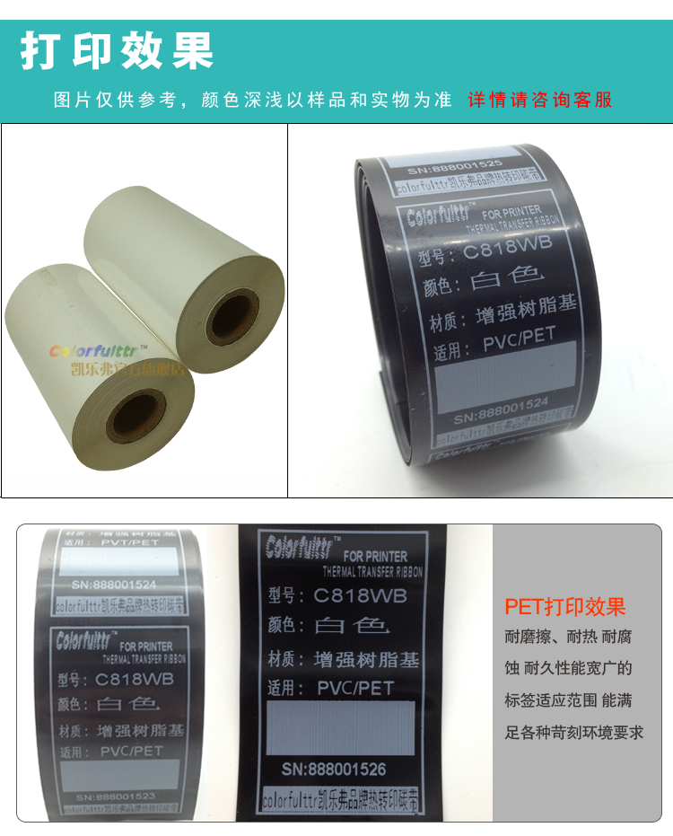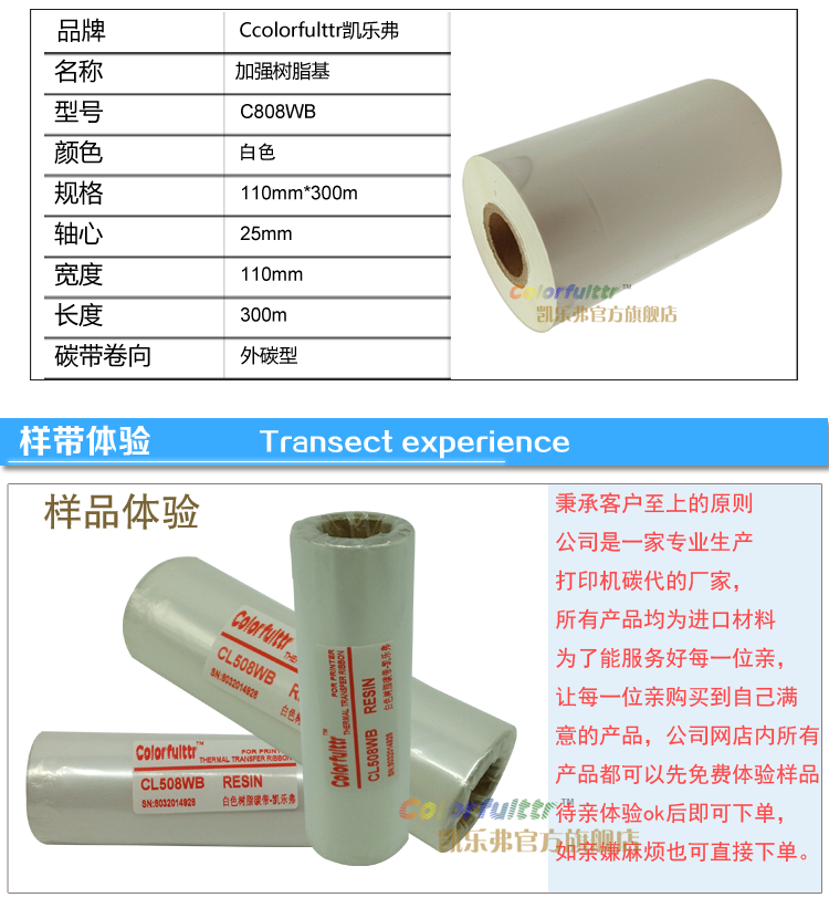 | | | 新品 | 凯乐弗C818WB白色碳带全树脂110mm300m标签打印机碳带不干胶色带 |
