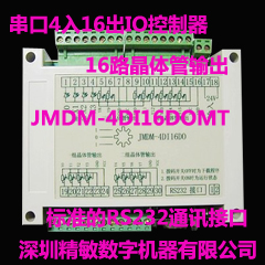 简介 JMDM RS-485/232 串口控制 4 路输入 16 路输出系统,是深圳市精敏数字机器有限公司自主研发的串口控制数字量输入输出系统的一款应用,主要由电脑和工业级高可靠全光电隔离数字量输入输出的串口控制器实现的,具有操作简便、抗干扰、性能稳定、功能强大、经济实用等特点,是各种数字量、开关量控制制的高性能、低成本、简便易用的解决方案。 一套完整的串口控制输入输出系统主要由七部分组成: JMDM 工业级高可靠性串口控制器、串口通信线、带 RS232 接口的电脑、外部输入器件、外部输出器件、电源。核心部件为本公司自主研发的 JMDM 工业级高可靠性全光电隔离串口控制器 JMDM-4DI16DO,可实现独立控制或上位机串口控制 4 路全光电隔离数字量信号输入和 16 路全光电隔离数字量信号输出。可用于采集 4 路数字量/开关量信号输入,如光电传感器、霍尔传感器、接近开关、红外线传感器等数字信号的输入;可控制 16 路数字量信号输出:电磁阀、气缸、继电器、LED 灯串、普通电机等执行器件。精敏上位机串口控制软件提供了一般应用场合常用的输出控制按钮和输入显示按钮,方便客户直接使用,客户无需懂任何专业的编程语言,直接使用精敏上位机串口控制软件即可实现电脑串口控制数字量信号的输入输出,同时可提供上位机串口控制的 VB 范例程序和通信协议,方便使用者在此基础上进行二次开发、集成,可用于 20 路以内的 I/O 学习、实验、工业应用。 系统使用说明 | 2.1 硬件连接注意事项 1)JMDM-4DI16DOMT 采用交流 18V 或直流 24V 供电,请选用高品质电源; 2)注意严格按照产品说明书后面所附的接线图接好外部数字量输入部分、外部数字量输出部分、控制器、电源之间的连接;电源接线更要严格、仔细检查确认无误后再接,否则将烧坏控制器或外部输入输出等设备; 3)控制器的外围输入输出采用直流 24V 或 12V 供电时,应与相应的外部输入输出器件相匹配; | | 2.2 精敏上位机串口控制软件说明 1)安装软件: 打开精敏上位机监控软件包,双击 setup 安装软件即可,或者直接双击 support 文件夹中的.exe 可执行文件也行。 2)选择串口号、控制器地址: 在串口选择框中选择要操作的串口(串口几在设备管理器中查看,电脑无串口的需要使用 USB 转串口设备并安装好其驱动);在控制器选择框中选择要操作的控制器,串口控制 1 台控制器时,选控制器 1; 3)检测输入点输入状态:在输入点检测对话框内可看到四个输入点的状态。 4)控制输出点输出状态:在输出点控制框内可控制十六个输出点的输出状态。 | | 2.3 上位机软件扩展功能描述 1)利用串口调试助手发字符串指令控制 I/O: 客户也可不用精敏上位机软件,自行根据通信协议二次开发,或者使用通用软件如串口调试助手,发送字符串来控制 I/O;对于简单应用场合采用 RS232 通信,电脑与控制器之间是一对一的关系;最大通信距离是 10 米;对于复杂应用场合可以采用 RS485 通信,电脑与控制器之间是一对多的关系;最大通信距离是 1.5 千米,每个控制器可以设定不同的地址,一台电脑或主控 PLC 控制最多大255 个控制器。2)多台组网构成大型远程测控系统: 通过地址编码和 RS485 组网,一个主控机最多可以寻址、控制 255 台控制器,即一台电脑可以与255 台精敏调光控制器组成大型远程测控系统:控制器和主机之间、多台控制器之间的距离均可通过 RS485 总线延长(最长 1 千米),这样主机可以放置在离控制器比较远的地方,实现远程组网控制。 3)定制化需求: 可根据客户特定需要,定制符合客户要求的多样化、个性化应用的控制系统功能、上位机控制软件,如定时、循环自动控制数字量输入、输出;或编程设定输入输出之间的逻辑关系。 | 性能参数1、工作电源:主电源:AC18V (或 DC24V);外围驱动电源:DC24V 或 DC12V;