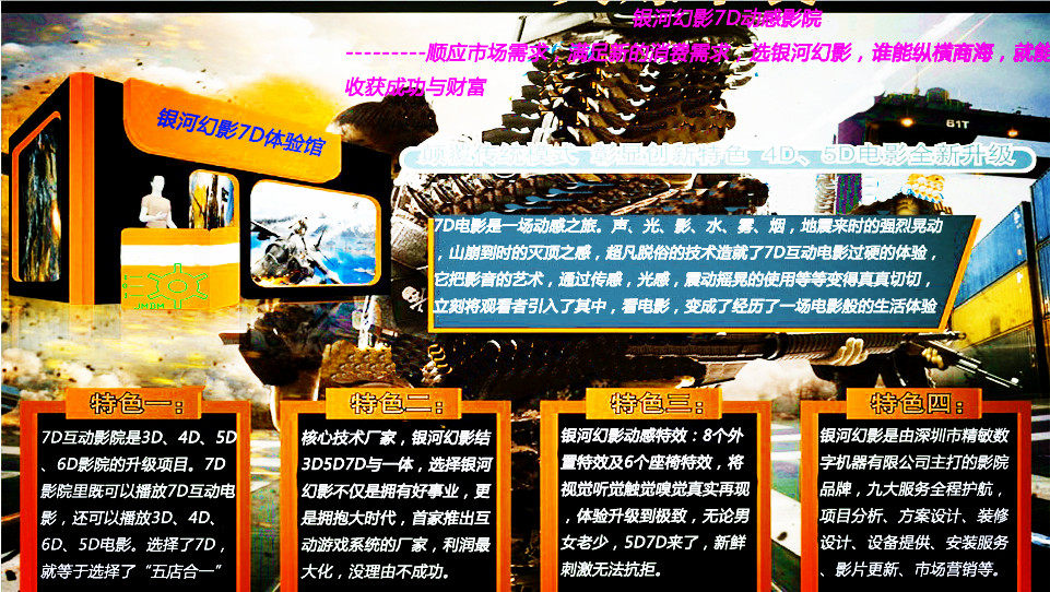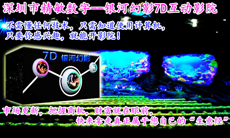 5D 7D 8D影院源头研发商--精敏数字,在国内率先推出7D互动影院,为国内大多数7D影院集成商提供了核心技术和设备!是国内7D影院的源头厂家和供应商,已经为诸多5D影院生意带来新一轮的财富潮!欢迎您也尽快加入吧!抢占“先机”,就是抢先尝鲜“大蛋糕”!