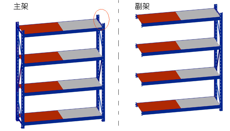 仓储货架的承载能力不同,层板、立柱、横梁所使用的厚度也会有所不同: 立柱可选厚度:1.4mm / 1.5mm / 1.8mm / 2.0mm / 2.3mm / 2.5mm 横梁可选厚度:1.0mm / 1.2mm / 1.5mm / 2.0mm(横梁厚度指的是:横梁管的厚度,而不是横梁挂片的厚度) |