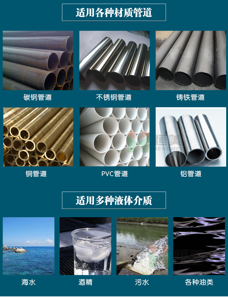 适用管材:适用于钢、不锈钢、铸铁、PVC、玻璃钢等均匀质密的管道;