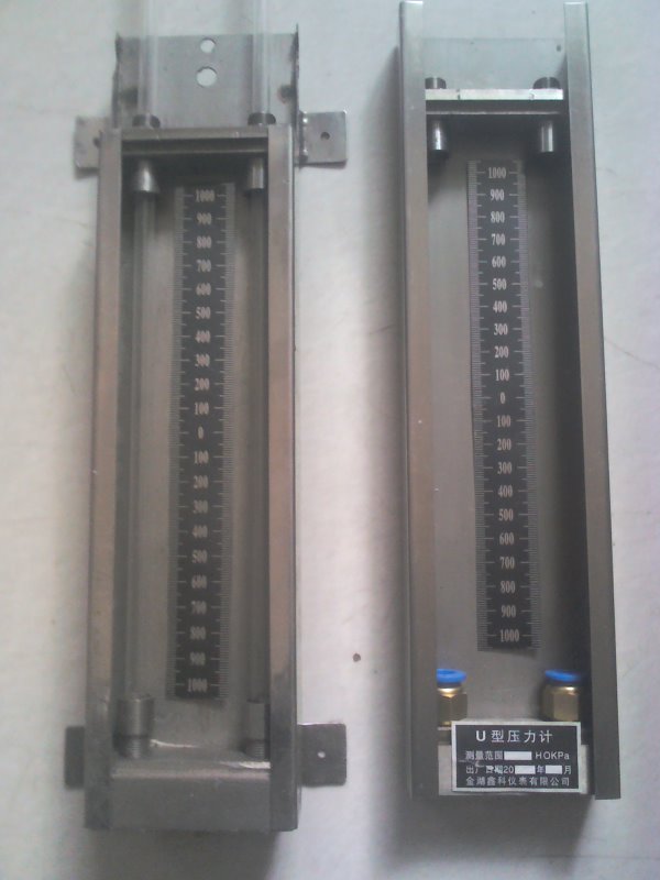 2、使用U型玻璃管压力计测量前必须注意所有压力计的最大量度应大于或等于被测压力,以防工作液冲出玻璃管口。使用时必须将U型压力计垂直悬挂在墙上或支座上,然后根据被测物压力的大小在U型玻璃管内注入工作液,(汞或有色纯水)注入量以至标尺刻度的1/2处为宜。