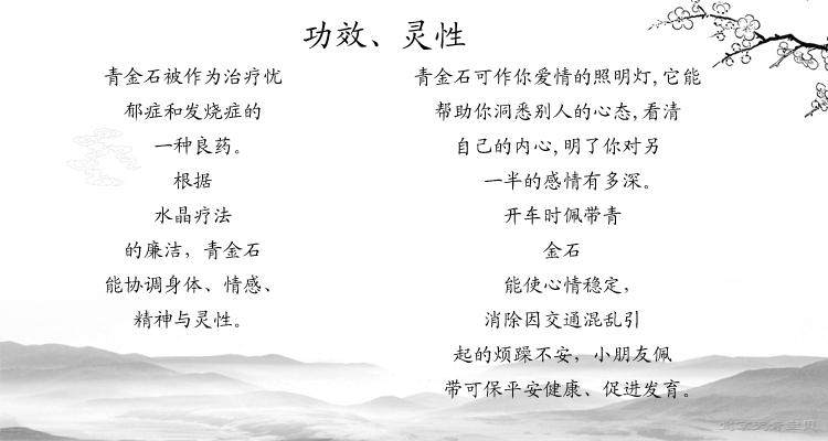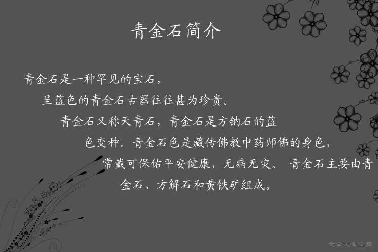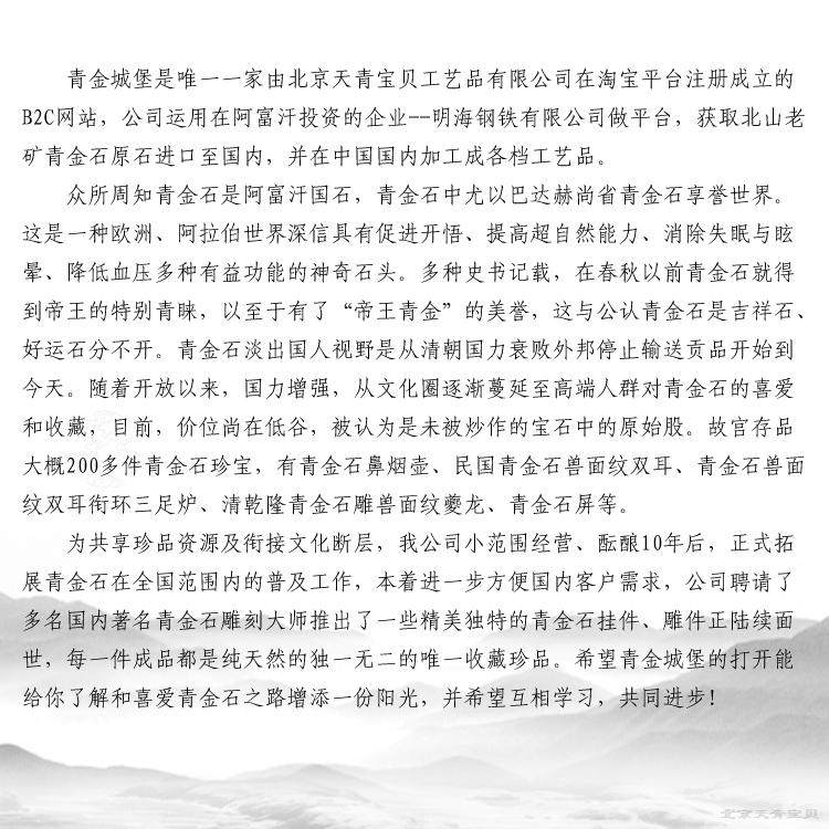 A:青金石是古老的玉石之一,它以其鲜艳的蓝色赢得东方各国人民的喜爱。在公元前数千年的古埃及,青金石与黄金价值相当。在古印度、伊朗等国,青金石与绿松石、珊瑚均属名贵玉石品种。在古希腊、古罗马,佩戴青金石被认为是富有的标志。青金石通常被制成腰圆形戒面或平板形,也被制成念珠,钟壳,表盘,烟盒和各种其它饰面物品。青金石也是一种适合男用珠宝饰物的宝石。和大多数其它宝石相比较,青金石柔和的深颜色更适合男式礼服。