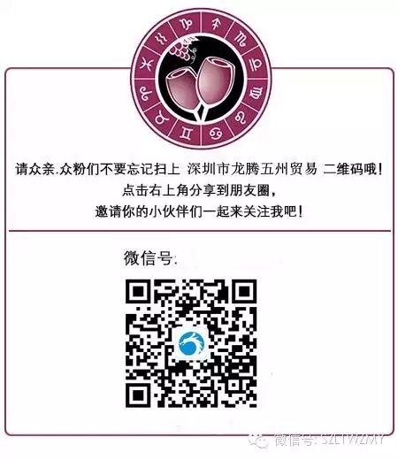 以上文章为深圳市龙腾五州贸易公司主要以提高生活品质,以及提升个人魅力为目的,如想了解更多红酒资讯,请关注我们的微信公众号:SZLTWZMY或者登陆www.szltwzmy.com