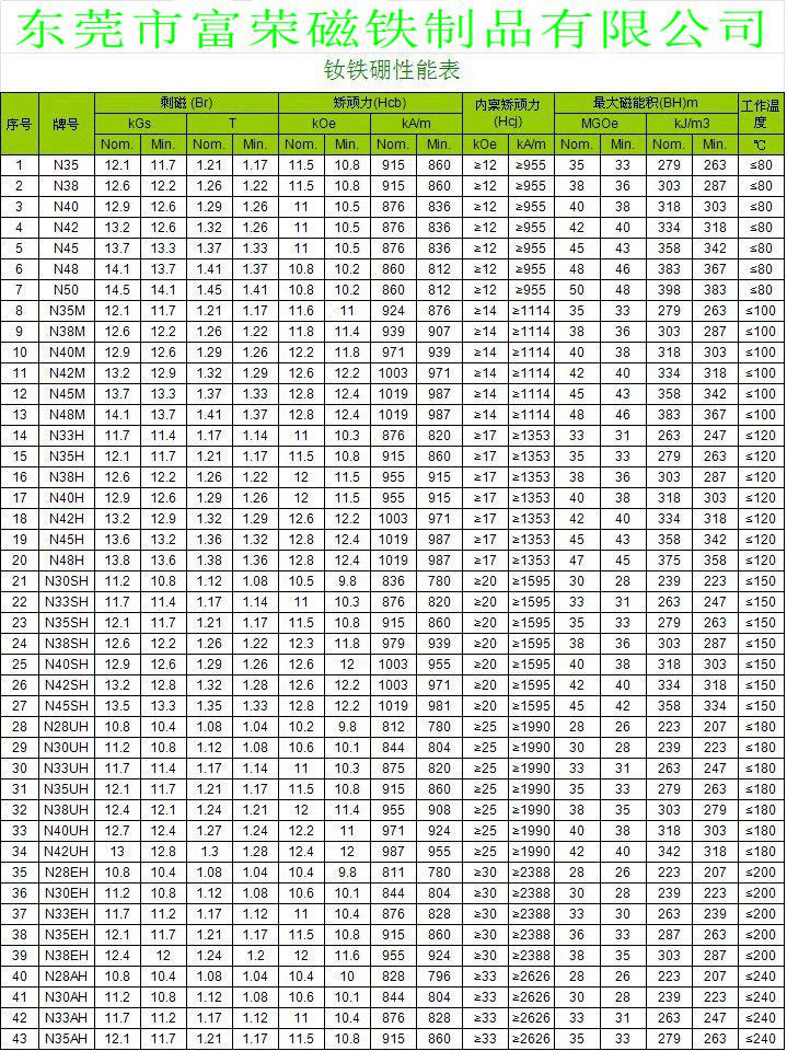 三、我司可生产多种牌号的钕铁硼磁铁,如下: