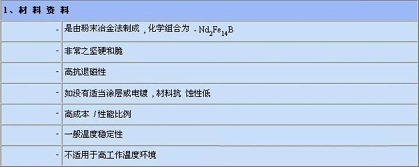 钕铁硼永磁材料是以金属间化合物Nd2Fe14B为基础的永磁材料。相对于铸造Al-Ni-Co系永磁材料和铁氧体永磁材料,钕铁硼具有极高的磁能积和矫顽力,可吸起相当于自身重量的640倍的重物。高能量密度的优点使钕铁硼永磁材料在现代工业和电子技术中获得了广泛应用,从而使仪器仪表、电声电机、磁选磁化等设备的小型化、轻量化、薄型化成为可能。材质特点钕铁硼的优点是性能价格比高,具良好的机械特性,易于切削加工;不足之处在于居里温度点低,温度特性差,且易于粉化腐蚀,必须通过调整其化学成分和采取表面处理方法使之得以改进,才能达到实际应用的要求。