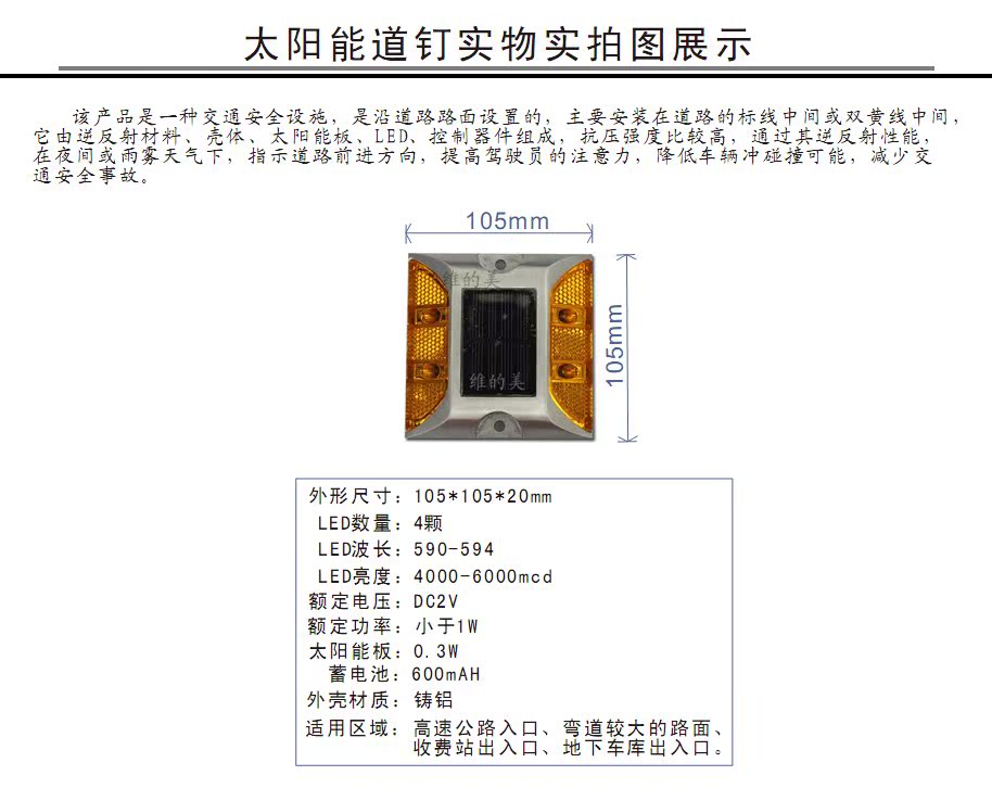 产品用途:(太阳能道钉)主要安装于高速公路及道路的标线中间 或双黄线中间标线上,当司机疲乏瞌睡时候,不小心汽车方向偏离车道压在道钉上会发出,咯噔、咯噔的声音,同时伴随着颠簸感觉,在光线不佳或夜晚给驾车者起提醒与警示的作用,让司机提醒司机安全行驶,降低事故发生率,安全行驶。