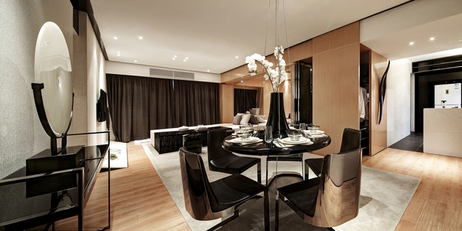 平面布局灵活多变,设计感十足,利用空间的过渡关系,增强空间的通透性以及展示效果,用材料和装饰将“旅行”的概念进行完美的演绎。色彩上,以沉着大气的深灰色为主色调,配以原木色和黑色元素,营造出成熟而优雅的气息。摩登现代的镜钢玻璃、金属质感的枝条装饰、细腻的木纹巧妙地运用于空间与细部的表现当中,共同营造出旅行带来的轻松与宁静。多元化的设计想法,为整个空间增添了很多乐趣,自然的原木色保留着木头的质感和温和的色调,舒适、简约。
