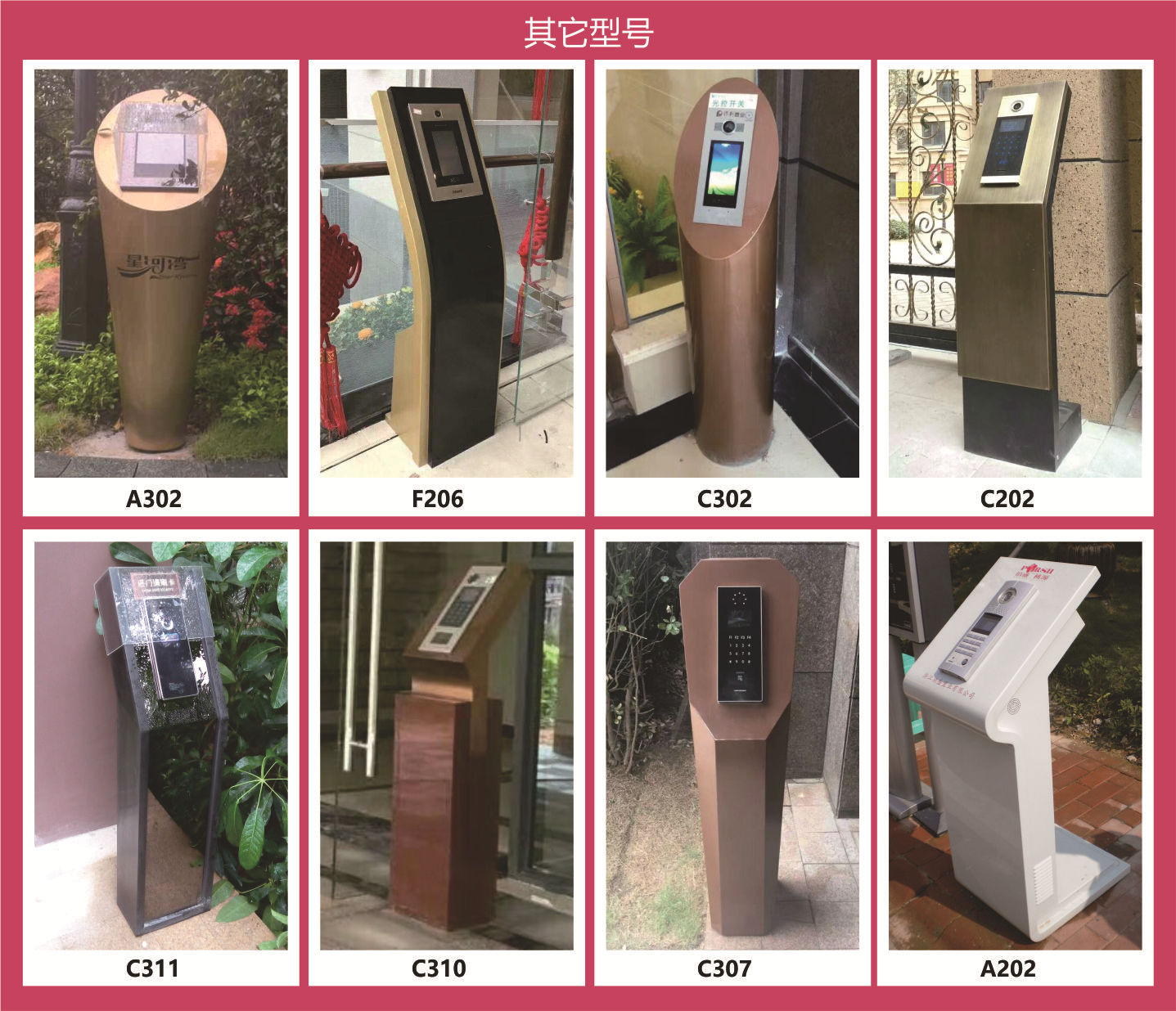 门口机立柱通常选用不锈钢镜面或拉丝板,钛金板,玻璃,亚克力板,铜板,铝板,冷轧板,大理石,不锈钢管,实木作为表面材料,内部结构采用不锈钢管,黑色金属型材为加强材料。门口机立柱的制作工艺;金属采用焊接,折弯,洗槽,车床,水切割,线切割,打磨,抛光,拉丝,电镀,氧化,腐浊,烤漆。亚克力和玻璃表面采用丝印,贴即时贴,雕刻,喷砂等工艺根据设计图纸来综合加工。门口机立柱关键在设计理念和制作工艺的合理性。门口机立柱的设计是整个项目的前期而后期制作完成材料和工艺起到致命性的作用。