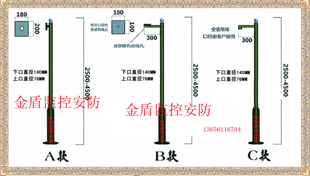 买家必读:金盾监控安防,优质的立杆供应商。本店所售商品如果买家收到货发觉不满意我们全额退款并且承担来去运费。我们做的就是人与人之间的一种信任。本店所售立杆不含运费只能走物流。运费由买家承担,立杆是根据高度以及材质议价的。