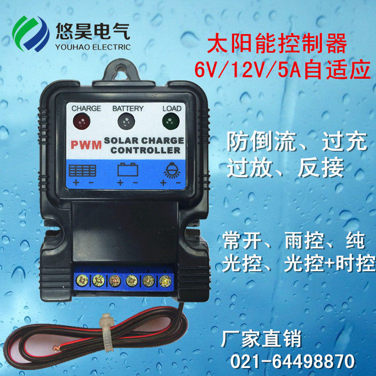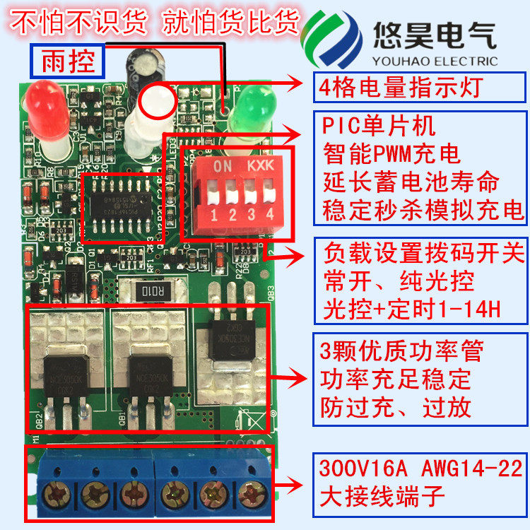 优质智能太阳能控制器: 带雨控功能,检测到雨水延迟2秒断开输出,雨水干延迟60秒恢复输出。