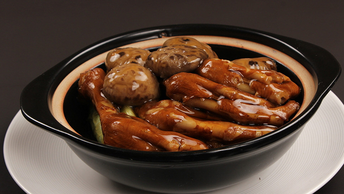 3、将灼水后洗净的鸡翼整齐地排列在品锅中,加入酒、盐、味精和姜片,将吊清的原汤和花菇一并倒入品锅中(至品锅沿l厘米处),加盖隔水蒸2小时30分钟,取出后拣去姜片,将花菇面只只朝上即可。