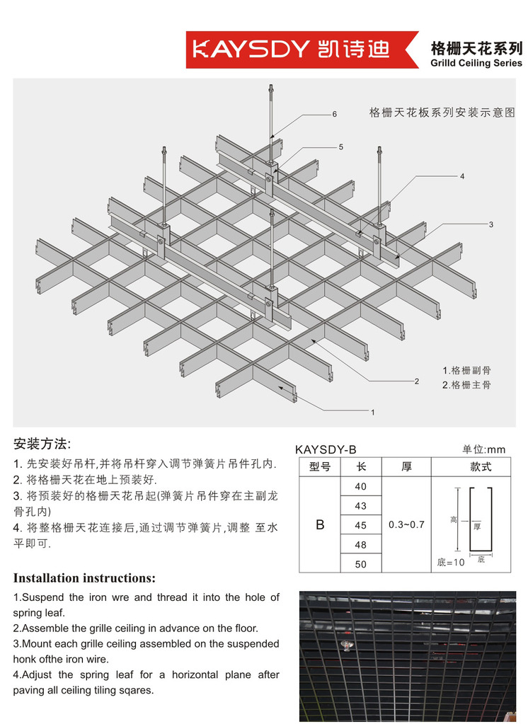 凯诗迪格栅天花吊顶系统通风效果好、防火性能高、安装简单、结构精巧、层次丰富、有开阔的立体效果、装饰后外观优美、色彩丰富经久耐用。吊顶可以随意另装格栅灯、筒灯等。格栅天花有不同的空间选择,可以与造型板组合安装,使现场效果更有特色。