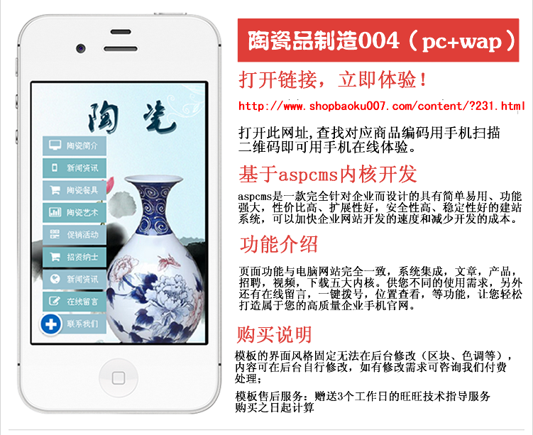 系统采用成熟cms网站系统开发,集成,文章,产品,下载,视频,招聘,单页,六大核心功能,不仅只有手机站,也有电脑端的pc站,真正做到pc+手机站的一体化,内容同步,手机站也可以静态生成,另外也有,一键拨号,一键地图,一键留言等功能,百分百满足您企业的手机官网需求。