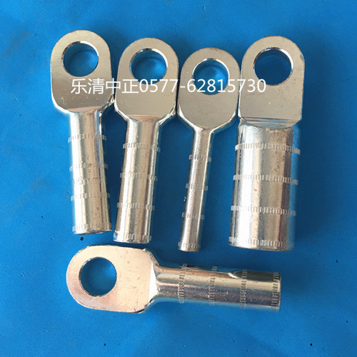 顶端这边为固定上螺丝边,末端为上剥皮后的电线电缆铜芯,品种分为堵油式和管压式,堵油式较好,为了抵御空气氧化,又有镀锡即在铜鼻子表面镀上一层锡,用以防止其氧化,变黑,大于10平方的才使用铜鼻子,小于10平方的电线不使用铜鼻子,改用冷压线鼻。铜鼻子有表面镀锡和不镀锡管压式堵油式之分。DT铜镀锡接线端子就是在原来DT铜接线端子的基础上,在表层镀上一层"锡",增强DT铜端子的导电能力。