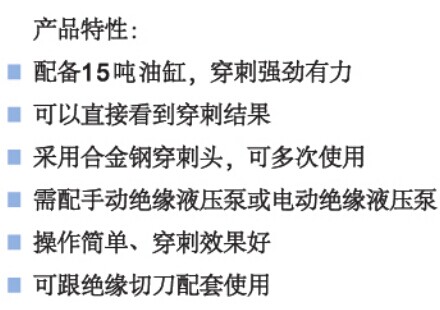 产品特性:1. 配备15吨油缸,穿刺强劲有力2. 可以直接看到穿刺结果3. 采用合金钢穿刺,可多次使用4. 需配手动绝缘液压泵或电动绝缘液压泵5. 操作简单、穿刺效果好6. 可跟绝缘切刀配套使用