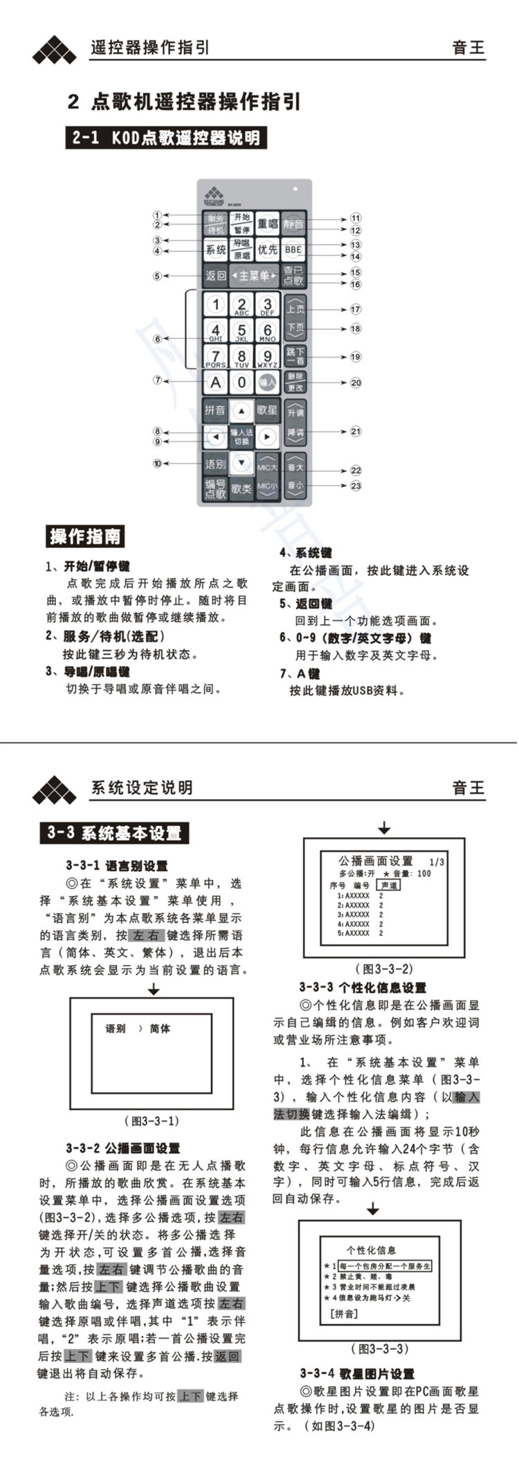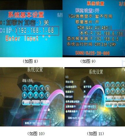 注意事项:1.单机版默认为IP为192.168.1.68:网络版服务器默认IP为:192.168.6.1 2、无线路由器如果是默认IP是192.168.1.1 IP为192.168.6.1网络版服务器是无法登录路由器的设置画面的,通过修改服务器的本地IP,改为192.168.1.2才可以登录路由器设定为6段IP,修改完成后,再把本服务器的IP改回192.168.6.1。3无线路由的LAN口IP不可以和服务器本地连接的IP一样,如无线路由IP为:192.168.6.1网络版服务器IP为192.168.6.1这样设定是错的。4上面的介绍是IP-LINK路由器出厂默认IP为192.168.1.1的设置,接单机版可以不做IP调整,网络版需要调整,每个品牌的路由器设置不同,具体方法查看路由器说明书,或联系路由器厂家。5、设置无线路由IP的时候网线不要插在WAN口。6不关闭无线路由器的DHCP会造成网络版点歌机无法启动情况。四、点歌机IP设置和查看 1、单机版(单机版和路由器连接正常可以跳过此步骤,单机版默认IP192.168.1.68)在公播画面-遥控器按“系统”键-输入密码347437“-系统基本设置-翻到最后一页“IP”(如图8),可以使用遥控(删除/更改)键,修改点歌机IP,按以下输入键,可以输入点“.”。 2网络版 点歌机IP会通过DHCP自动分配,如要修点歌机IP段,可以效果服务器本地连接IP4段,查看网络点歌机IP可以通过遥控器和触摸屏。