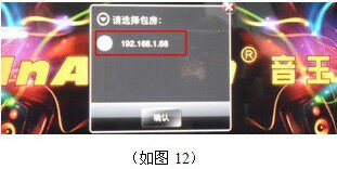 五、点歌机软件设置 音王点歌机软件1、打开软件会出现包房自动搜索,选择点歌机IP对应的包房。(如图12),进软件后“服务”项同样可以校队IP.