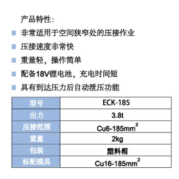 产品特性:1.非常适用于空间狭窄处的压接工作2.压接速度非常快3.重量轻,操作简单4.配备18V锂电池,充电时间短