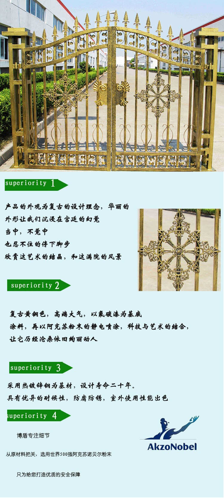 复古的设计理念,华丽的外形让我们沉浸在宫廷的幻觉当中,不知觉中也忍不住停下脚步,欣赏这艺术的结晶,和这满园的风景。复古黄铜色,高端大气,以氟碳漆为基底,再以阿克苏粉末的静电喷涂,锌钢的材质,科技与艺术的结合,让它历经沧桑依旧绚丽动人,让我们的产品在各种恶劣环境下都能轻松胜任,免除了因生锈、褪色、老化、涂料等日常维护的烦恼,可达15年免维护,还可根据您的需要定制门中门的