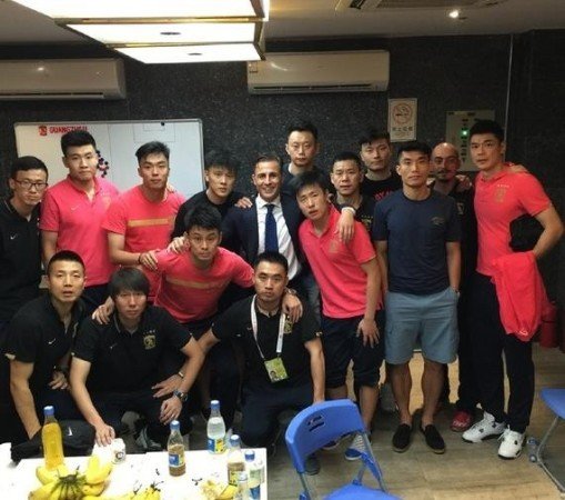 在更大的更衣室里,卡帅也和共处半个赛季的弟子们,留下了最后一张合影。合影中,郑智、曾诚、郑龙,李铁等人全部板起了脸,只有照片中央的卡帅,笑容依旧阳光灿烂。再与球员简单告别后,卡帅离开了更衣室。在登上去往机场的专车前,卡纳瓦罗这位执教恒大不到半个赛季的教练接受了记者采访。这时,卡帅哥的头型罕见的有些凌乱,可西装却依旧笔挺......