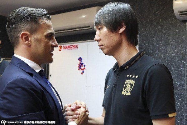 在这场比赛第80分钟,郑龙用一记精彩的落叶球帮助恒大扳平了比分。此时,场边的卡纳瓦罗早已脱去了西装外套。看到弟子奉献如此精彩的扳平球,卡纳瓦罗也是欣喜若狂,他张开双臂,单腿跪地“迎接”着争气的弟子。