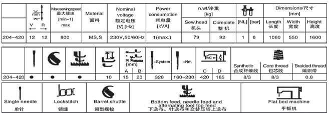 ◆Characteristics: High top feed stroke,excellent climbing properties and high needle pene-tration power guarantee the unproblematic sewing over cross seams or thick spots in the workpiece.Optimized sewing kinematics for tight and excellent stitch formation.Powerful and effective alternating feeding system for constant stitch len.The GA204 class sewing machine with large barrel shuttle has been specially designed for processing the extreme thread and material thicknesses of heavyweight materials.Seams of leather goods,the manufactring of technical textiles and special sewing tasks when processingleather products and uplolstery,are among the extensive range of applications of the 204. ◆主要技术规格 Main Parameters