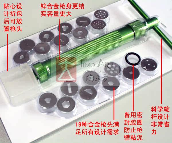 旋转式白卡版挤泥器(专业套装含):这款挤泥器完全按照进口版挤泥器进行设计制造,2013年新品,超高性价比。枪体容量更大,科学旋杆设计,使用更省力。枪体和推杆有胶圈密封,挤泥时残留较少,方便清理。19款枪头随意搭配,特殊技术之神器。单品价格:80元/支