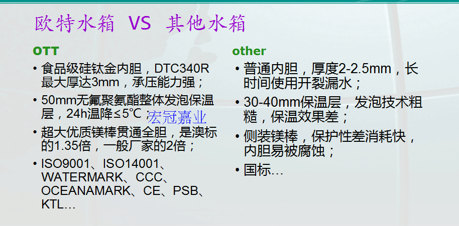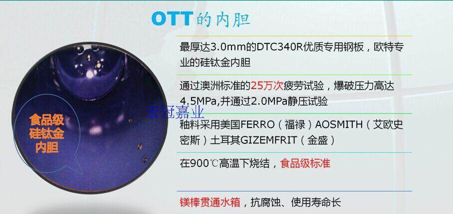 OTT·欧特公司产品简介 产品分为容积式电热水器、容积式燃气热水器、储水式换热器类。 商用容积式电热水器容积分为:115升、200升、300升、450L,功率从3Kw 6KW (220V)到9KW 15KW 24KW 36KW 45KW 54KW 72KW (380V)。 容积式燃气热水器容积从135升180升200升300升380升,热负荷:17MJ 20MJ 30MJ 45MJ 85MJ 100MJ 162MJ 200MJ 295MJ 356MJ(5KW、8.4KW、14KW、24KW、82KW、99KW)。 储水式(搪瓷盘管、铜盘管)换热水箱 150升200升300升450升,可辅助加热,换热面积从0.8到2.5,可满足不同的家庭及商业需求。OTT欧特 容积式商用电热水器适用范围:家庭、学校、宾馆、别墅、浴池、美容美发中心、健身房游泳池等,来满足多个点同时供应热水(采暖也可以)!