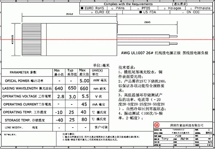 结构特点: | 高品质激光二极管+金属外壳+优质透镜+恒定功率电路板+导线 |