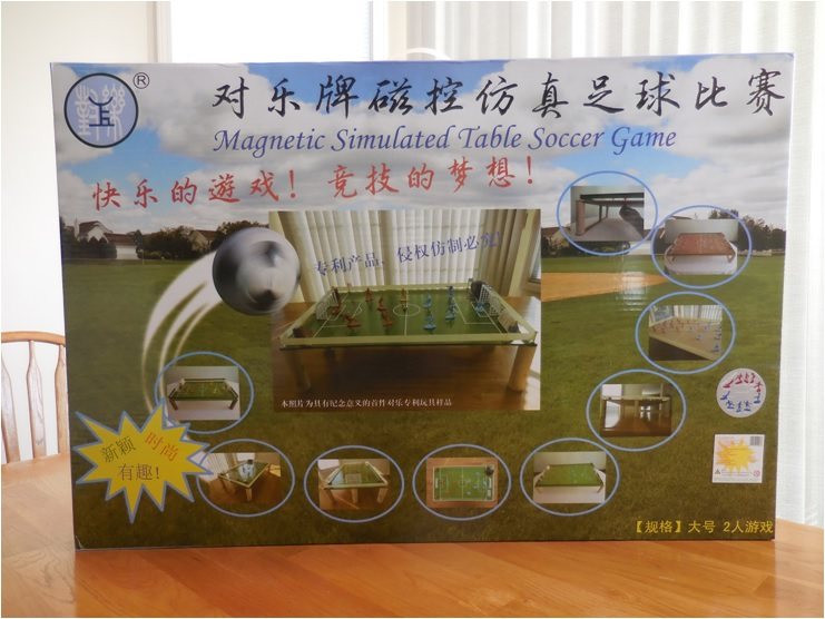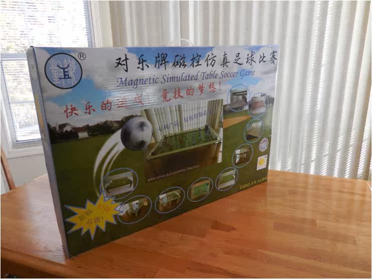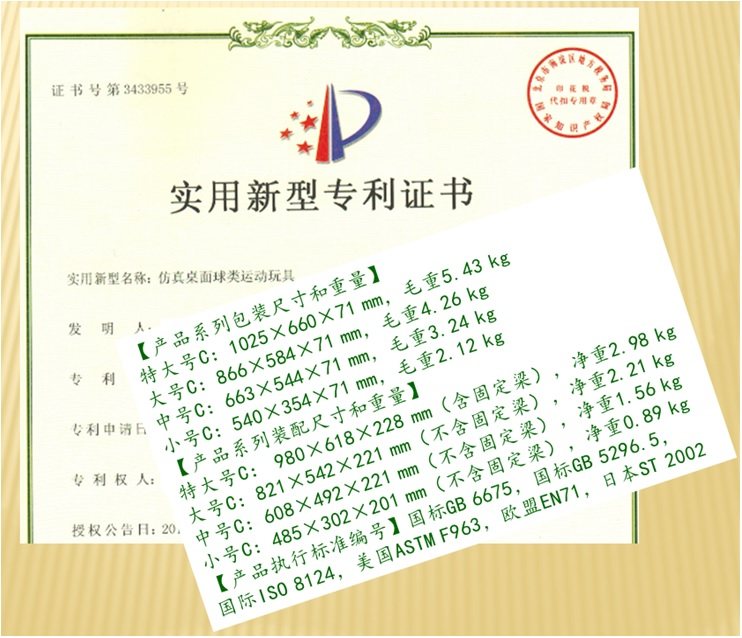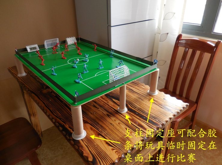 健身,益智,快乐!新一代竞技娱乐专利产品!大号产品适合两人进行激烈的全场板对抗。9名红色球员人偶和9名蓝色球员人偶。大号产品包装尺寸和重量:866×584×71 mm,毛重4.26 kg。大号产品装配尺寸和重量:821×542×221 mm,净重2.21 kg。
