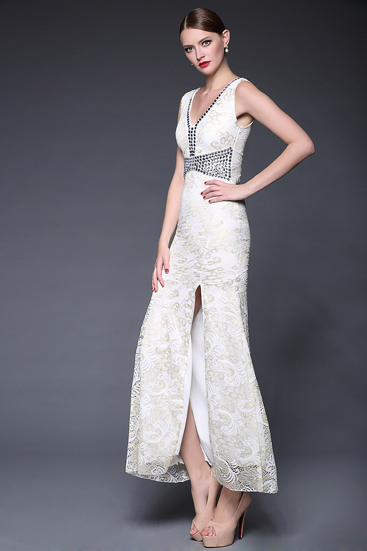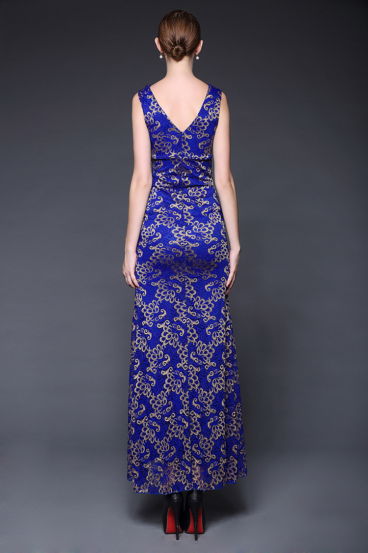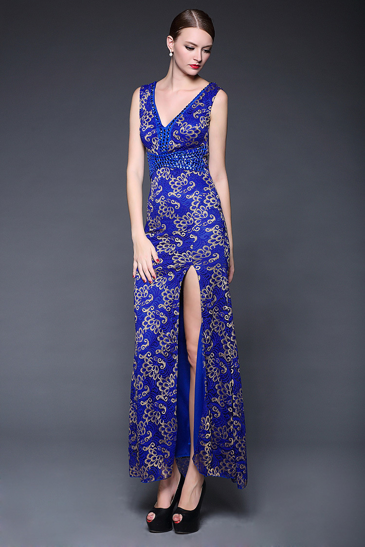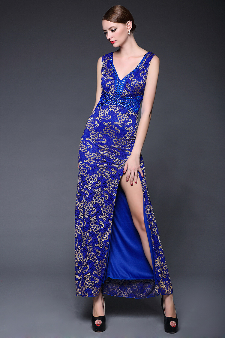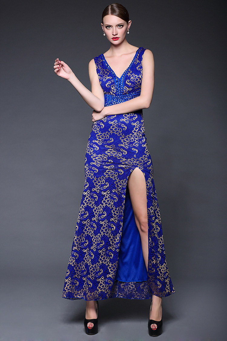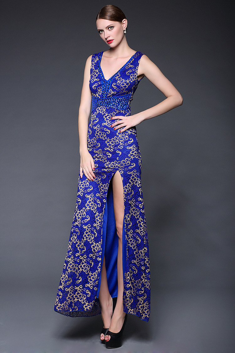 2015夏季 女装新款性感修身蕾丝开叉V领晚礼服 连衣裙W0237