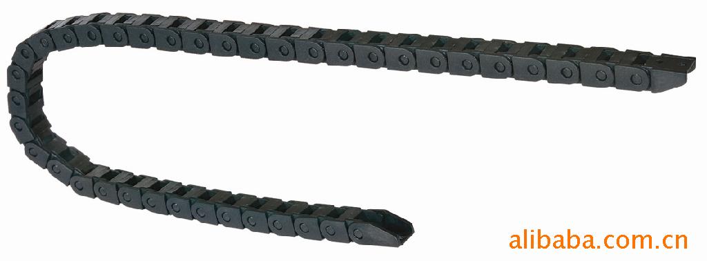 TLP15系列轻型尼龙拖链内高15mm,不可打开,支撑能力不能超过行程的1/2,而且与内置电缆和管子的重量有关,两端联接的联接器使拖链与机械设备相连接,各种拖链重量是不同的,超过行程的1/3和重量,则需要使用支撑轮。