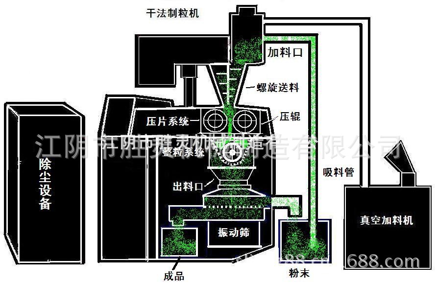 原料由加料口螺旋喂料机,对物料进行预压缩,经预压缩的物料被压入两个相对转动的两对压辊中间进行压实,其压实力是通过油缸的推力由压辊传递给物料的,被压实的片状物料自动脱槽进入破碎机,将其破碎成大小不均的颗粒体,然后进入整粒机进行修整。被修整的颗粒通过带网孔的筛板被挤压出来进入筛分机,成品颗粒通过筛分后进入斗式提升机被送入成品仓。筛分下来的粉状物通过螺旋输送机返回原料仓,再次压实由此完成一个封闭式循环。