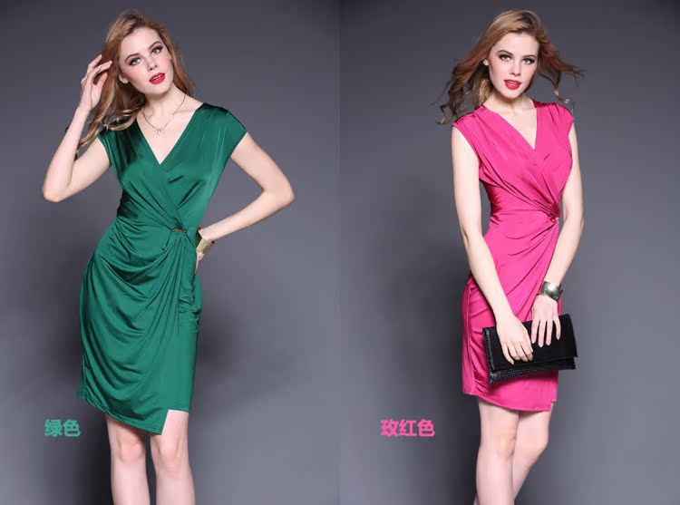 Q8025 2015夏装新款简化净色金属扣折皱超显瘦连衣裙