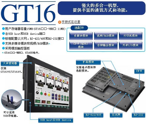 GT16主要面向高端市场,适应网络等广泛应用的扩展功能,它支持65536色显示,高亮度,色彩更加真实自然,操作时可享受完美的视觉感受。标准内置9MB,最大可扩展至57MB。其屏幕尺寸有15英寸、12.1英寸、10.4英寸和8.4英寸。